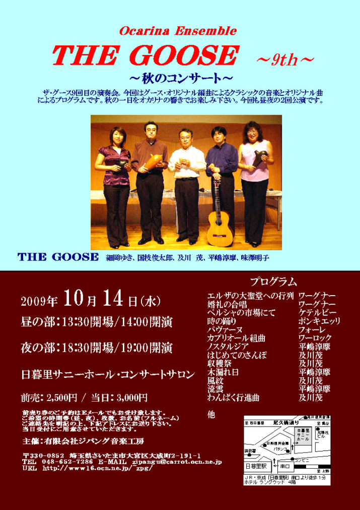 ザ・グース9回目の演奏会。今回はグース・オリジナル編曲によるクラシックの音楽とオリジナル曲によるプログラムです。秋の一日をオカリナの響きでお楽しみ下さい。